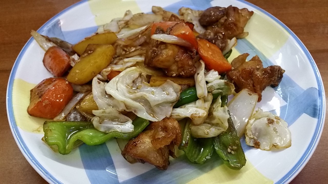 鶏肉を、一度サッと揚げてから野菜と炒めてるようで