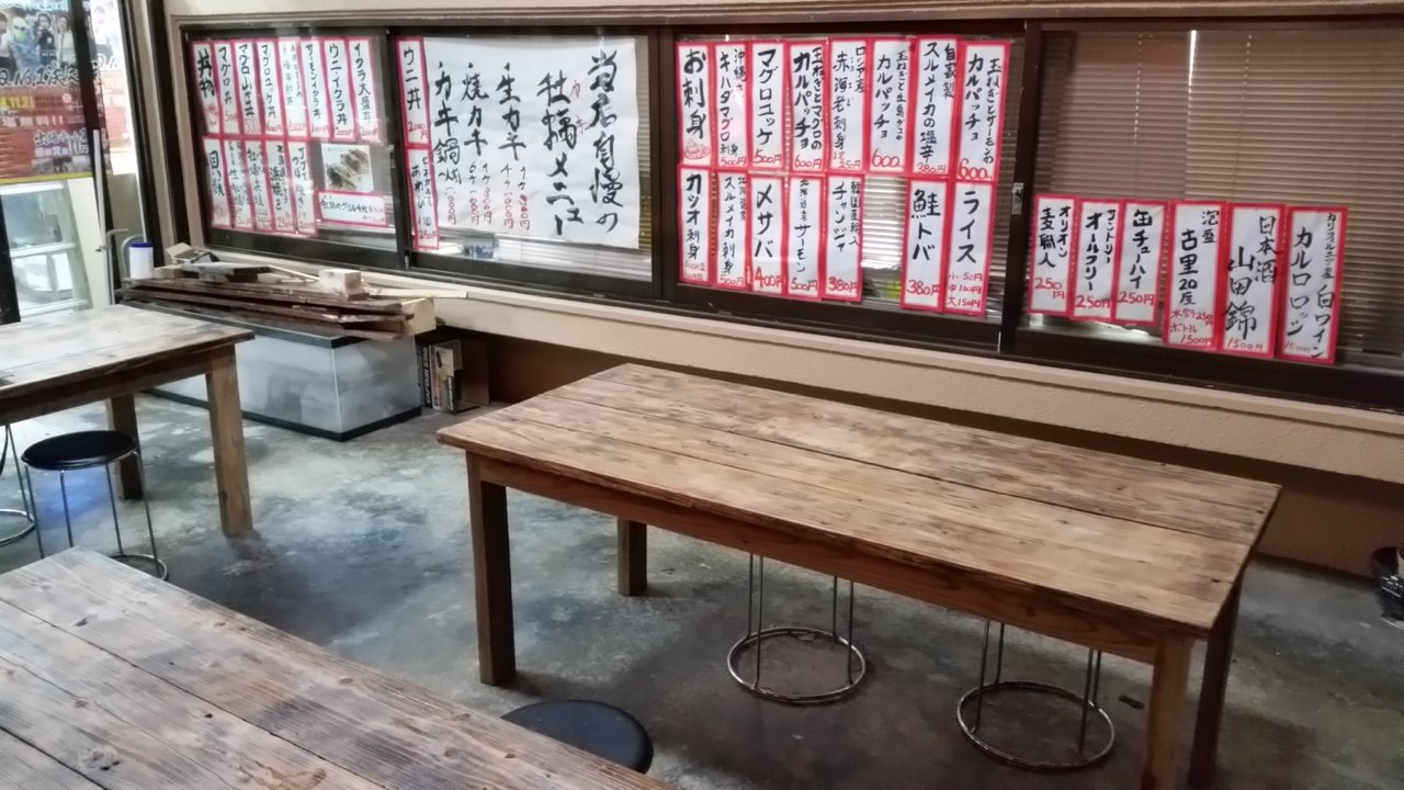 テーブルが4つ。魚市場の回りにあるような